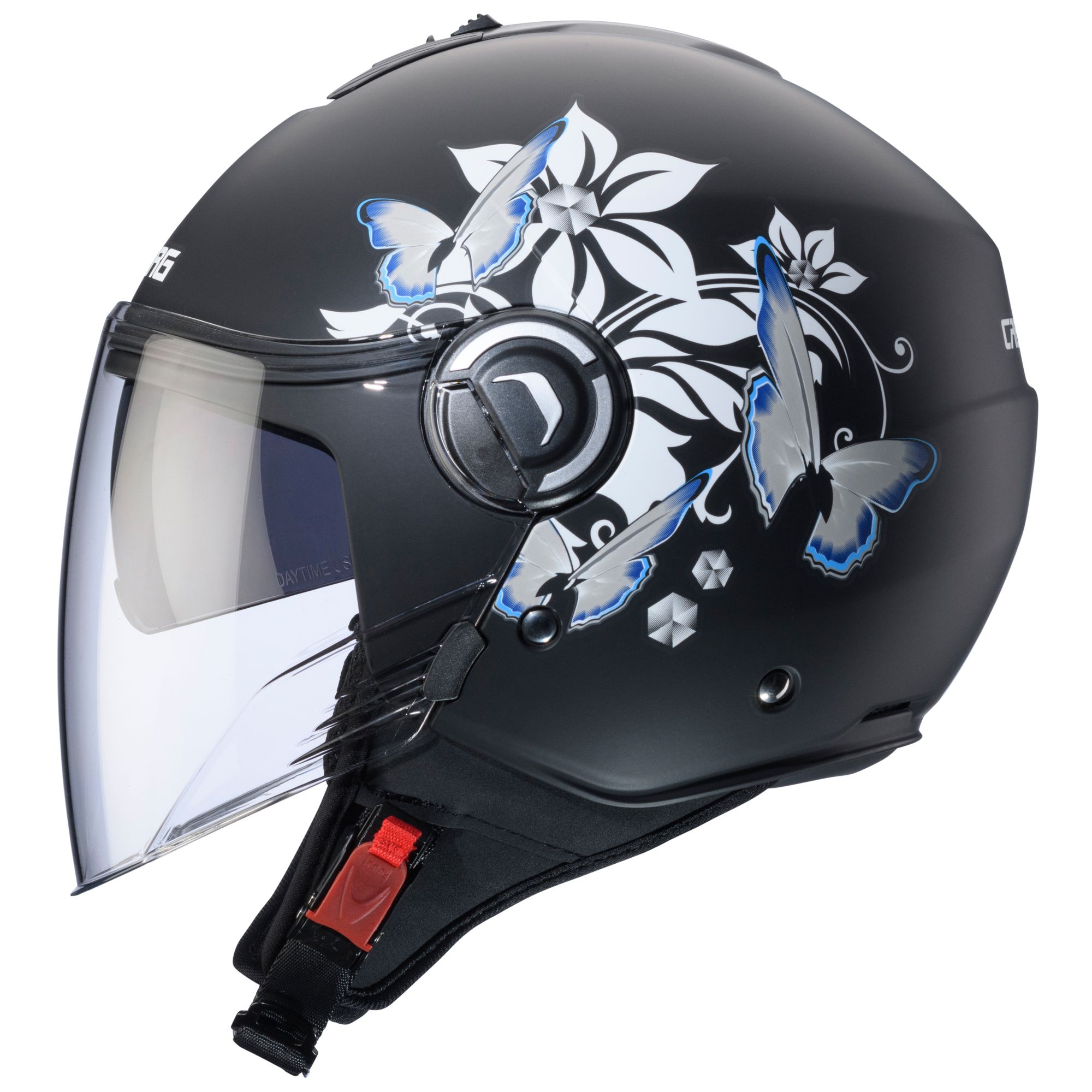 Der Caberg Riviera V4 X Jethelm mit dem Dekor Mia in den Farben matt-schwarz/weiß-grau-hellblau verfügt über die folgenden Eigenschaften: