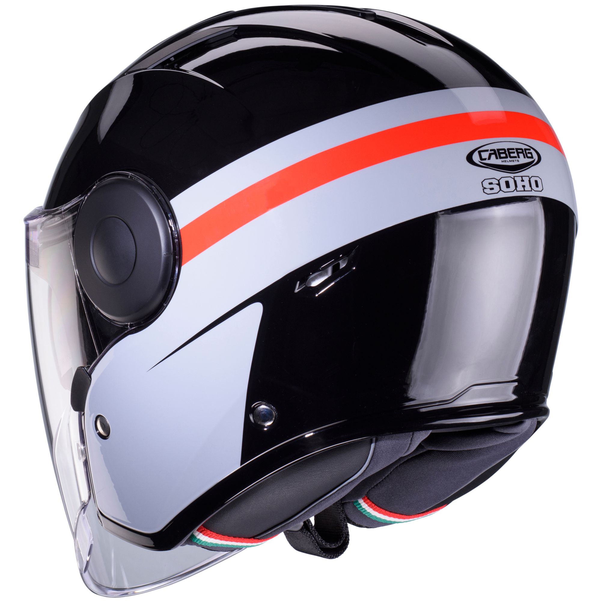 Der Caberg Soho Jethelm mit dem Dekor Zephyr in den Farben schwarz/grau-rot verfügt über die folgenden Eigenschaften: