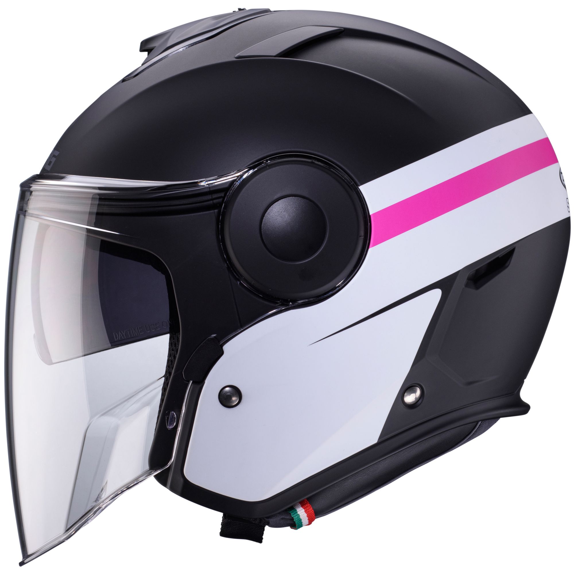 Der Caberg Soho Jethelm mit dem Dekor Zephyr in den Farben matt-schwarz/weiß-Fuchsia verfügt über die folgenden Eigenschaften: