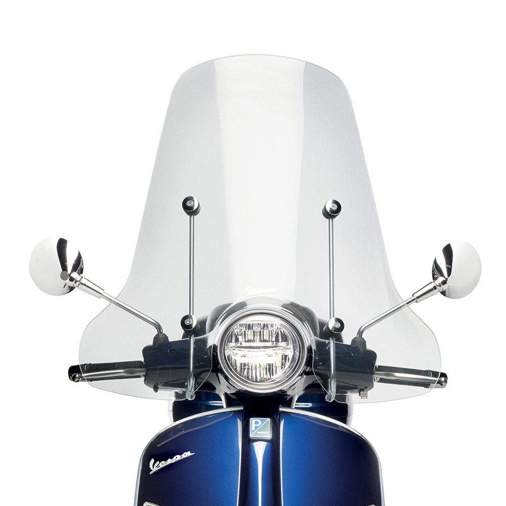 Das Vespa Logo und die verchromten Halterungen runden den effektiven Windschutz des hohes Vespa Windschilds ab.