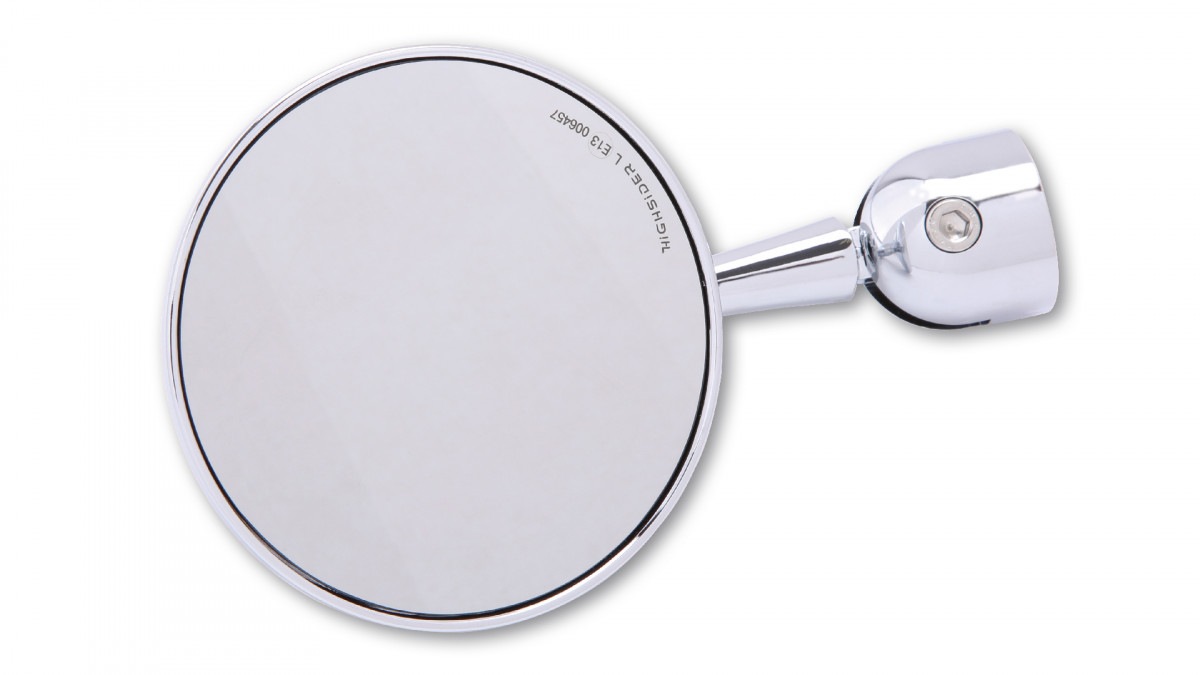 Edler, CNC-gefräster Lenkerendenspiegel mit einem runden Kopf aus hochwertigem Aluminium, verchromt. Der stilisierte Propeller auf der Rückseite des Spiegelkopfes unterstreicht das außergewöhnliche Design dieses Modells. Dank eines innovativen Universal-Klemmsystems passen die Spiegel für Lenker mit einem Lenkerinnendurchmesser von 12 bis 22 mm. Der Stiel ist nach oben und unten verstellbar und bietet eine noch bessere Sicht nach hinten und mehr Sicherheit. Für rechte und linke Seite verwendbar.