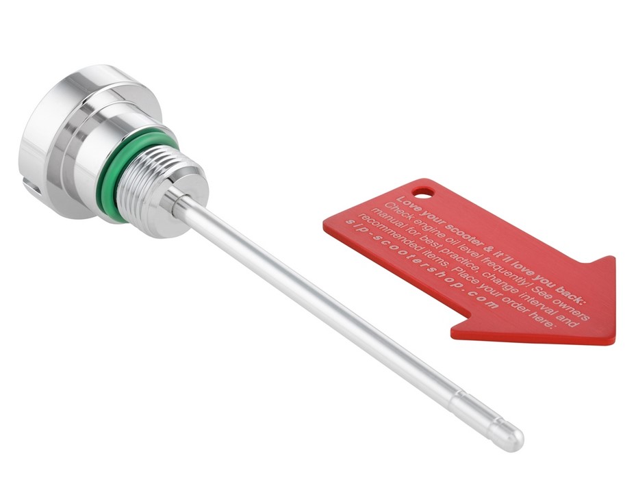 Die Öleinfüllschraube / Messstab SIP PORDOI für das Motoröl wird aus hochwertigem Aluminium CNC gefräst. Durch das schlichte Design sehen die Öleinfüllschrauben an jedem Fahrzeug schön aus und fügen sich gut in das Gesamtbild der Vespa ein. Am Messstab ist die Skala entsprechend der originalen Einfüllschrauben ausgerichtet, der passende Dichtring ist bereits angebracht.Oft werden die serienmäßigen Einfüllschrauben bei parkenden Fahrzeugen entwendet. Um Unbefugten die Arbeit zu erschweren, haben wir an ein kleines Sicherheitsplus gedacht und liefern ein spezielles Montage-Tool mit den Einfüllschrauben welches praktischer Weise auch als Schlüsselanhänger genutzt werden kann.