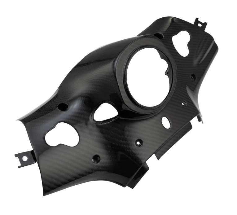 Carbon-Teile sind nicht nur wegen ihrer robusten Eigenschaften und der leichten Bauweise gefragt, mit Anbauteilen aus Carbon suggeriert jeder Zweiradfan sofort den Bezug zum Motorsport. Die Attribute und die Optik die das Carbon mit sich bringt schaffen einen coolen Race-Look. Zwar ist der Aufwand die untere Lenkerverkleidung zu wechseln ziemlich groß, das Ergebnis lohnt sich aber. Die passgenaue Lenkerverkleidung aus Carbon ist einfach zu schön, um sie nicht zu haben! Als Basis für die Formen dienten die Originalteile, so können wir eine ordentliche Passgenauigkeit garantieren. Die Carbonteile selbst werden mit Hilfe von speziellen Formen aufwändig gefertigt und laminiert.