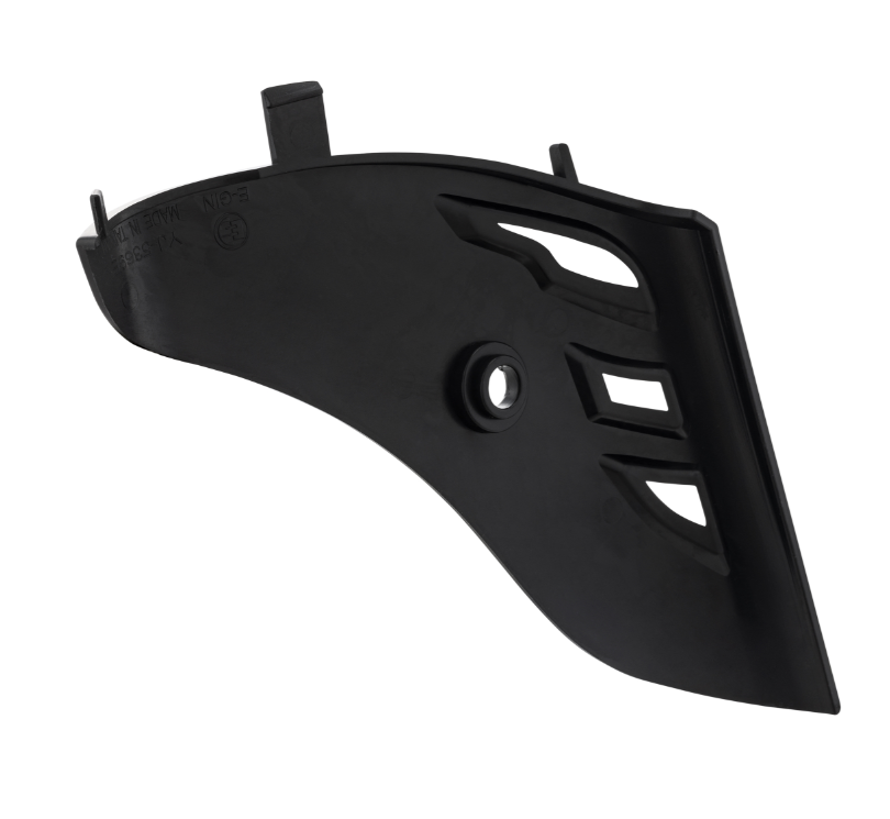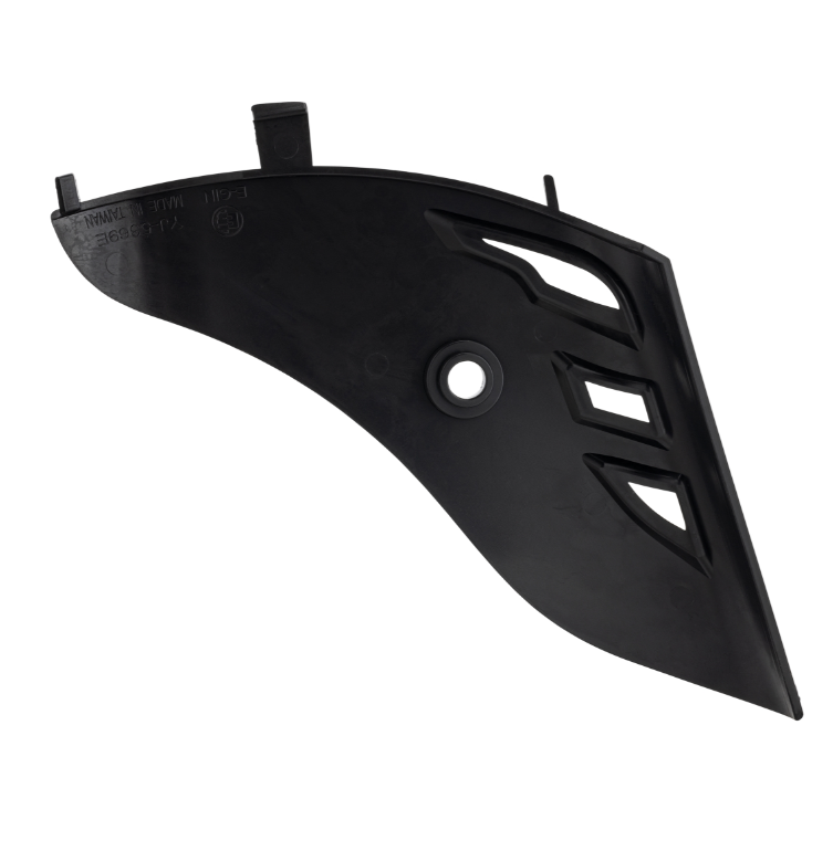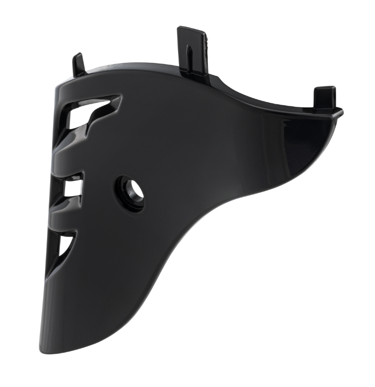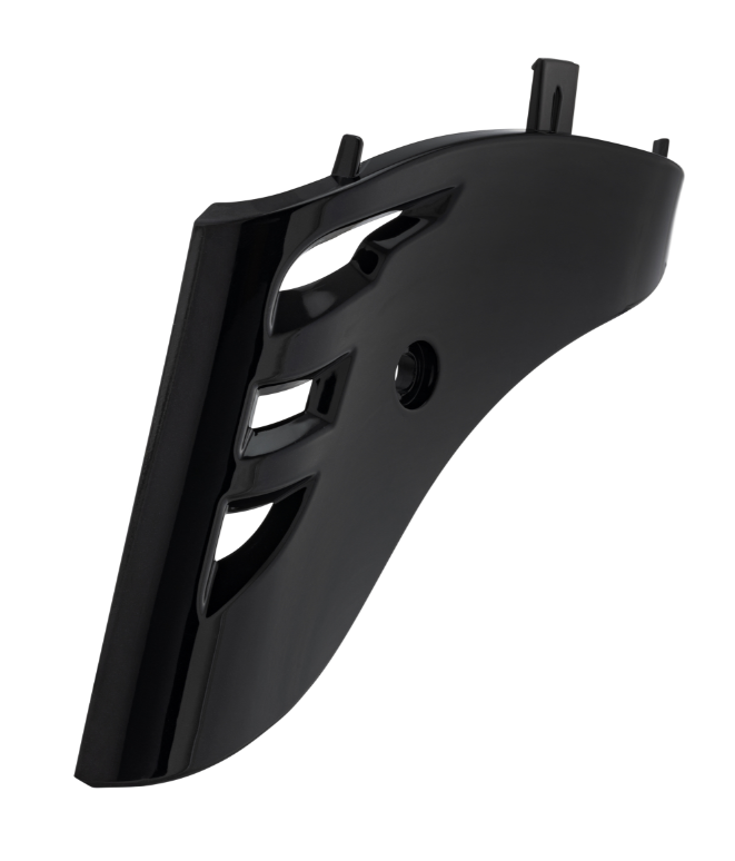 Die Gabelverkleidung mit ihren sportlichen Schlitzen wird aus hochwertigem Kunststoff gefertigt und anschließend in der jeweiligen Farbe lackiert, nicht wie beim Original welches aus lieblosem gefärbtem Kunststoff besteht. Der Austausch der Gabelverkleidung geht relativ unkompliziert, setzt aber ein wenig Geduld voraus, da die Befestigung an der Innenseite des Kotflügels etwas fummelig ist.