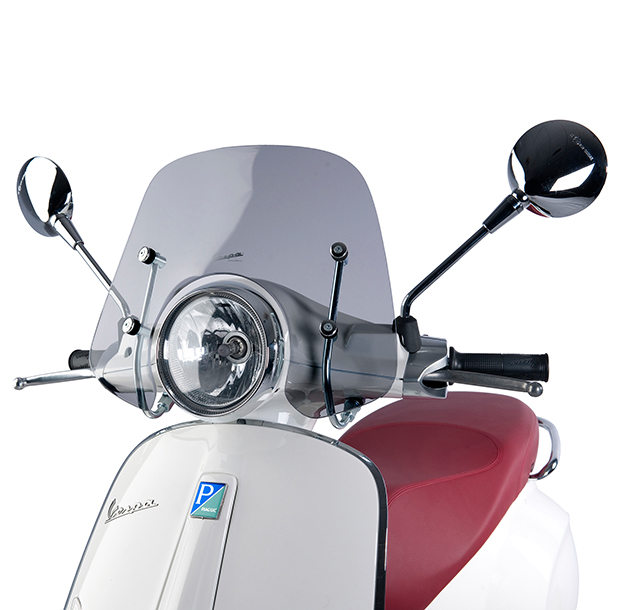 Original Windschutzscheibe Cruiser getönt für die Vespa Primavera / Elettrica. Passt auf 50er und 125er, und kommt in der getönten Version deutlich sportlicher daher. Das Windschild ist aus stoß- und kratzfestem Methacrylat und mit "Vespa" Schriftzug versehen. Die Befestigung ist inklusive.